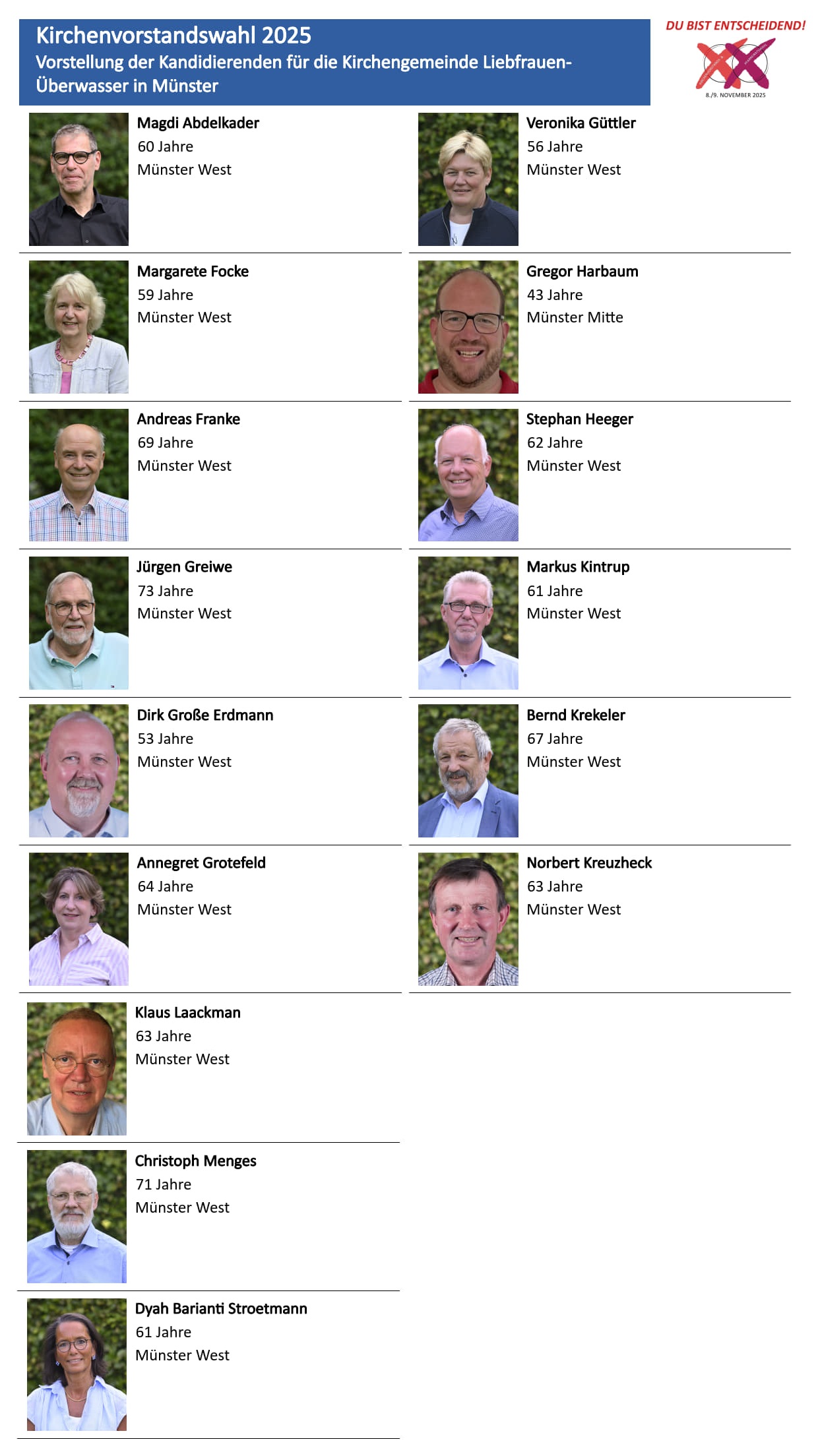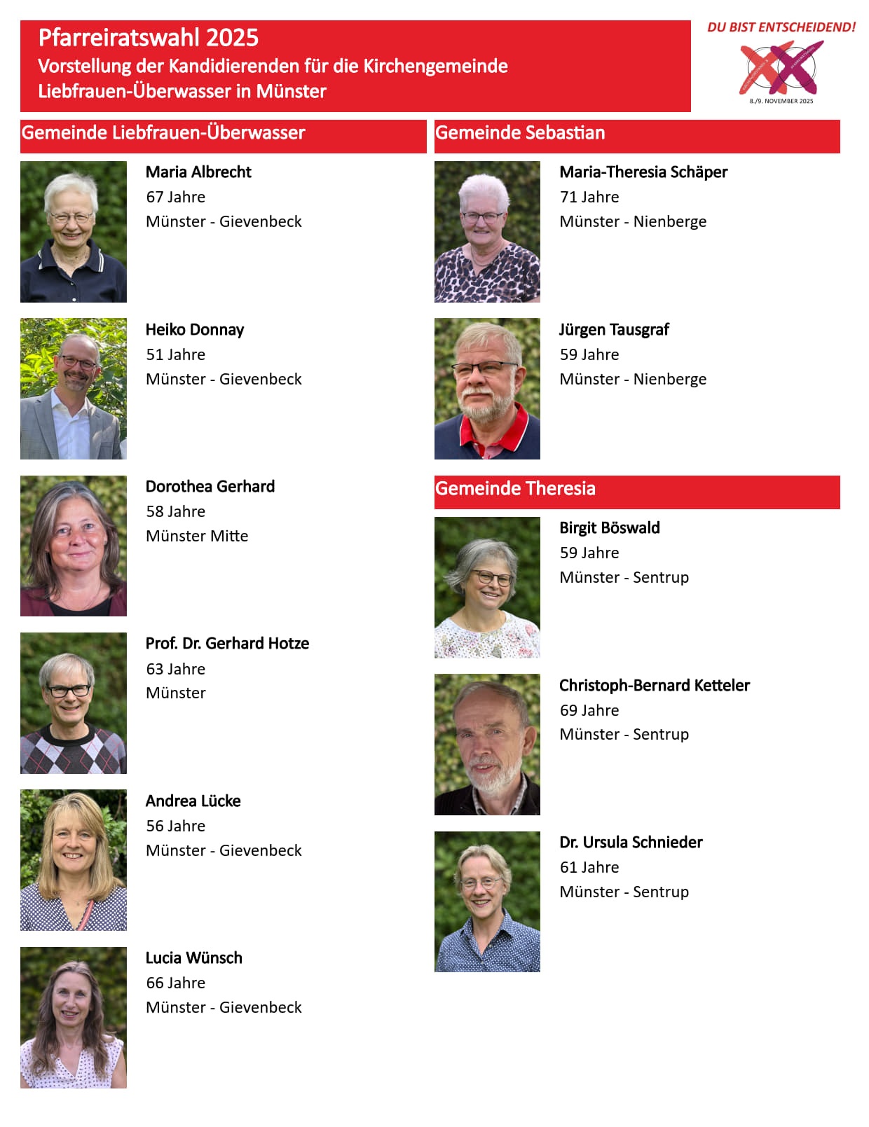 Am Wochenende 8./9. November 2025 werden im Bistum Münster die Pfarreiräte und im nordrhein-westfälischen Teil des Bistums die Kirchenvorstände neu gewählt, so auch in unserer Pfarrei.