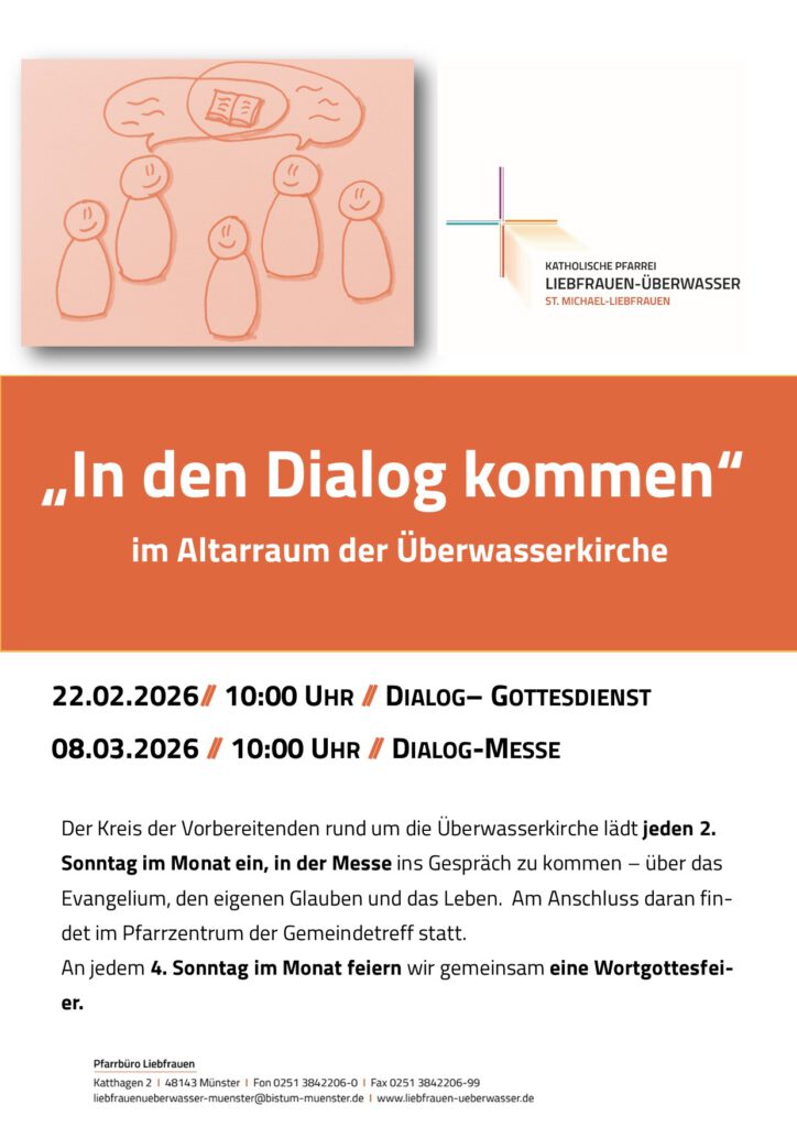 Am So., 22.02. findet um 10 Uhr im Altarraum der Überwasserkirche der nächste Dialog-Wortgottesdienst statt. Herzliche Einladung an alle, die Interesse haben miteinander über den Glauben, das Evangelium und das eigene Leben in den Austausch zu kommen.