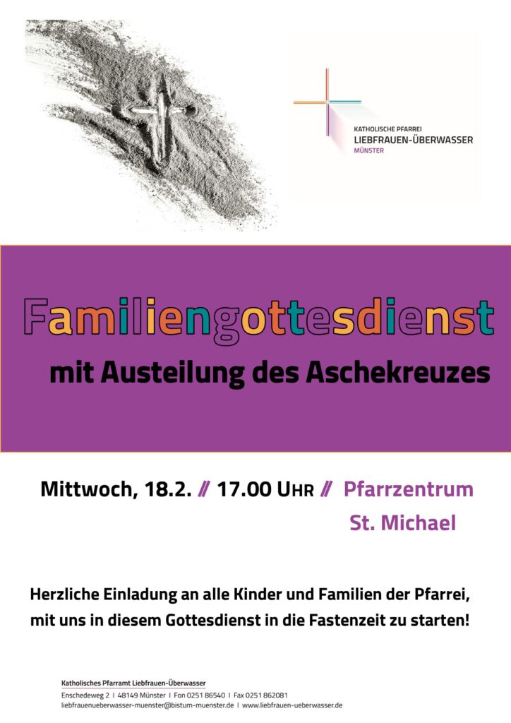 Am Aschermittwoch, 18.02. findet um 17 Uhr im Pfarrzentrum St. Michael für alle Kinder und ihre Familien ein Familiengottesdienst mit Austeilung des Aschekreuzes statt.