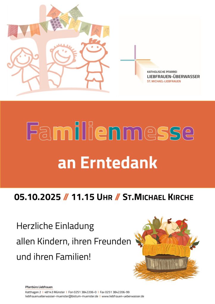 Am So., 05.10. laden wir wieder ganz herzlich alle Kinder mit ihren Freund:innen und Familien um 11:15 Uhr zur Familienmesse in die Michaelkirche ein.