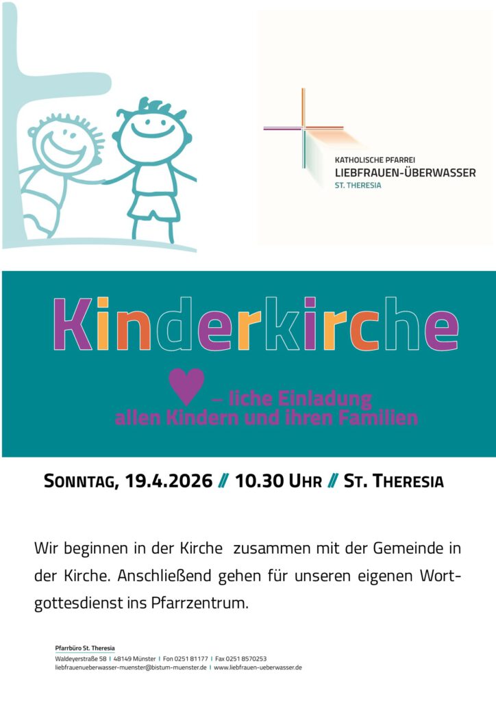 Am So., 25.01. sind alle Kinder mit ihren Freund:innen und Eltern in St. Theresia wieder zur Kinder-Kirche eingeladen. Wir beginnen zusammen mit den Erwachsenen um 10:30 Uhr in der Kirche und gehen dann für unseren eigenen Gottesdienst ins Pfarrzentrum. Herzliche Einladung!