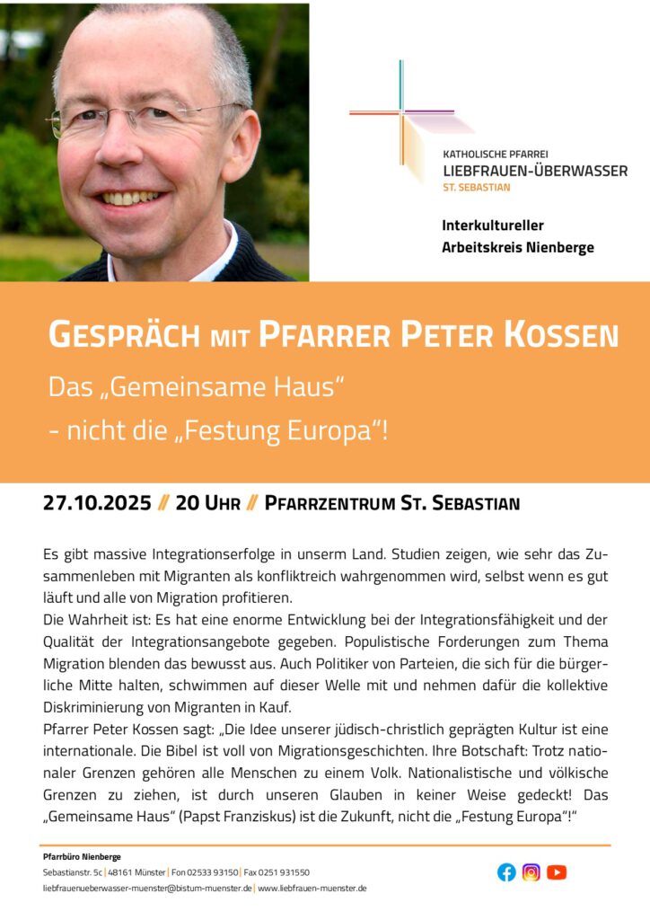 Am Mo., 27.10. lädt der Interkulturelle Arbeitskreis um 20 Uhr zu einem Gesprächsabend Das „Gemeinsame Haus“ – nicht die „Festung Europa“! mit Pfarrer Peter Kossen im Pfarrzentrum Nienberge ein.