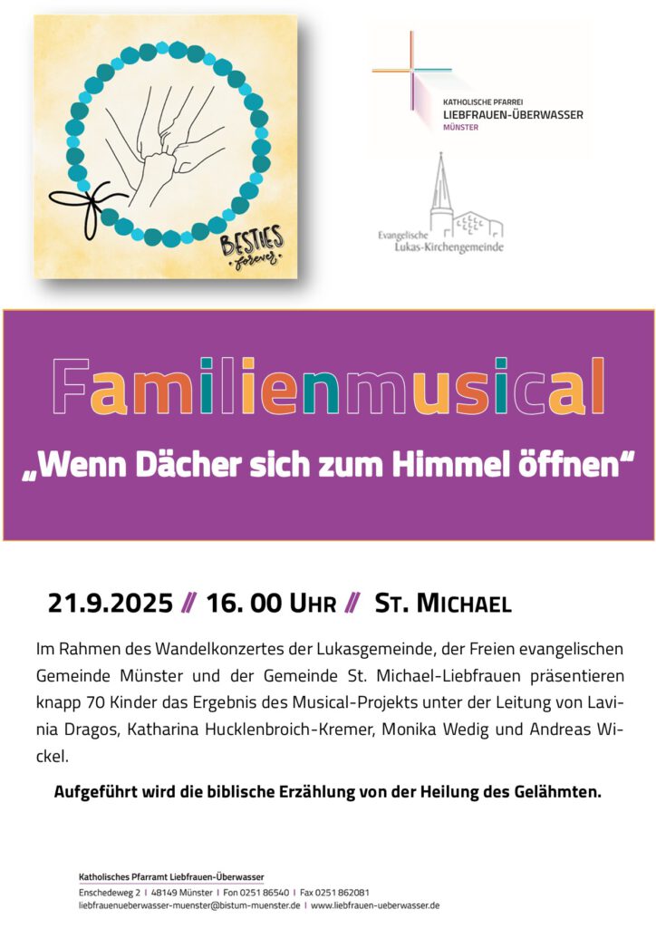 Am So., 21.09. heißt es um 16 Uhr für knapp 70 Kinder in St. Michael „Vorhang auf“: Im Rahmen eines Wandelkonzertes präsentieren sie das Ergebnis aus dem Musical-Projekt, das am Ende der Sommerferien stattgefunden hat. Aufgeführt wird die biblische Erzählung von der Heilung des Gelähmten.