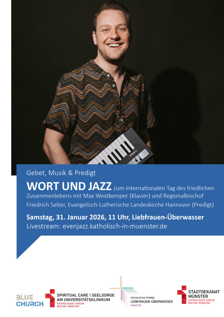 Am Sa., 31.01., 11 Uhr laden wir zum Format „Wort und Jazz“ in die Liebfrauen-Überwasserkirche ein. Die Reihe, verbindet liturgische Texte und aktuelle Themen mit improvisierter Jazzmusik und lädt so zu einer geistlich-musikalischen Atempause ein. Die Predigt hält Regionalbischof Friedrich Selter, Evangelisch-Lutherische Landeskirche Hannover. Max Westkemper (Klavier) gestaltet den Vormittag. Seine Musik umhüllt die Sprache, lässt sie leuchten, kontrastiert oder trägt sie meditativ. Der Eintritt ist frei.